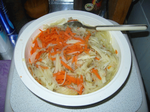 キャベツと人参のザク切りを、投入…