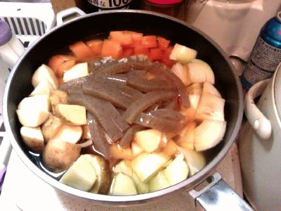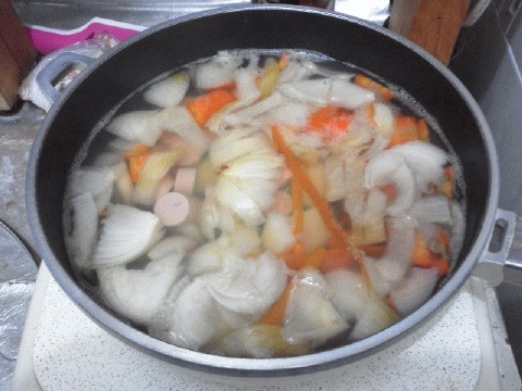 ジャガイモ・玉ねぎ・人参を、だし汁で煮る…