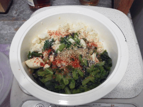 塩・コショウ・一味・サラダオイル・ゴマをかけて…