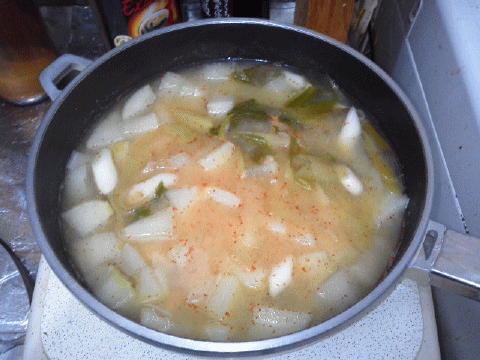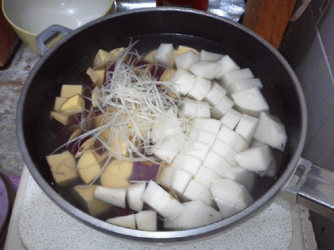 大根とサツマイモを角切り、長ネギを入れて、だし汁で煮る…