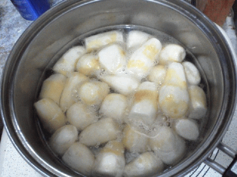 芋を取ったら、水を入れて、うどんを茹でます。これで、洗う時も簡単!