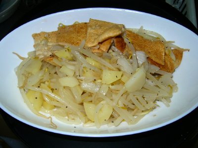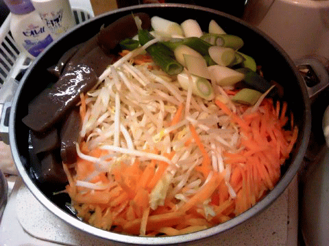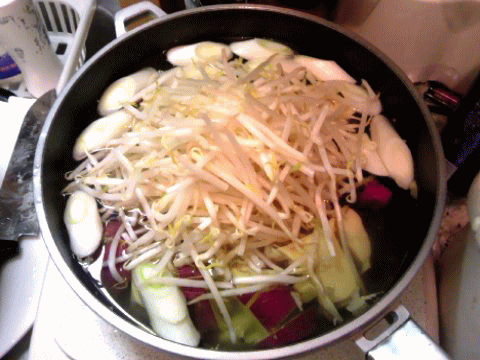 特売のモヤシ・ニンジン・長ネギ・ショウガ・コンニャクを、ダシで煮て。。