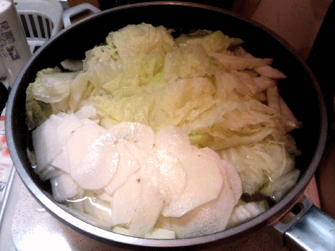 ざく切り白菜・角切り大根・ニンジンを煮て。。