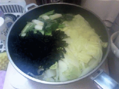 コンソメ・輪切りキャベツ・長ネギ・モヤシを入れて。。