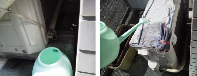 そして、扇風機を併用。温度計を見ながら、室温28℃をキープしつつ、扇風機の風に当たれば、キンキンの冷感。更に、室外機の排水は、じょうろに集め、定期的に、室外機にかける!(室外機の冷却)室外機の上には、使い古しのバスタオルを乗せて、長時間、気化熱が発生するようにしています。