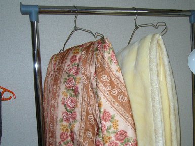 主の場合、ベッド脇に、ハンガーラックを置いてあり、起きると、毛布等を掛けています。天気の良い日は、そのまま、外の物干し竿に下げています。ハンガーは、100均のステンレス製。起き抜け15秒の手間で、その夜の快適が…(^o^)v