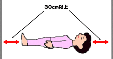 寝る時は、十分に寝返りが打てるスペースを確保しましょう。特に、頭上のスペースは、万歳しても手が当たらない程度に、確保して下さい。少なくても、30cm以上開けましょう。