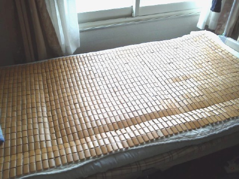 私が使用している竹シーツは、5年物。部分的に、竹が割れましたが、テープで補修すれば、問題なし。たまたま、ホームセンターの特価品(1,480円)で見つけ、試しに買ってみたのですが、元は取れていますね。(^o^)v