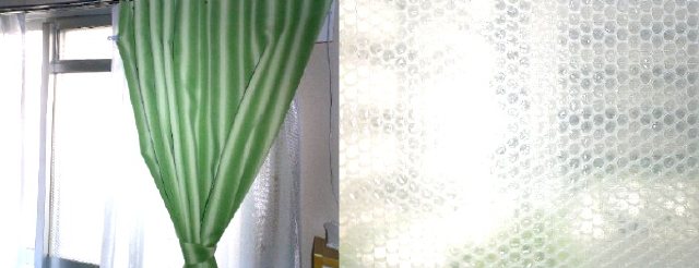 熱は、窓から逃げます。そのため、窓ガラスに、断熱材を貼っています。と言っても、プチプチシートを、水で貼るタイプです。ホームセンターで、680円♪ これだけで、エアコンフル稼働の夏の電気代が、15%減♪ 勿論、冬の冷たい冷気も、シャットアウトしてくれますから、冬も10%減♪ 2ヶ月で、元が取れ、未だに、そのままです。