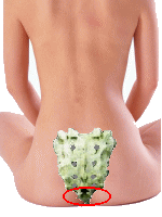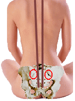 背骨の両脇にある筋肉(画像の茶色の部分)は、仙骨が出発点になっていますから、腰痛等で、それらの筋肉に障害が起こっている場合は、仙骨の痛みに繋がる可能性もあります。また、急に重い物を持ったり、高いところから飛び降りたりした場合は、仙腸関節(画像の丸の部分)が捻挫し、仙骨部に痛みを起こすこともあります。