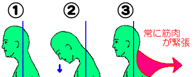 首が、正常な中心線より前方になってしまう(いわゆる猫背)と、首は、頭の重さに耐えられず、うなだれてしまうことになります。しかし、それでは、社会生活は送れません。そこで、首や肩の筋肉が緊張し、首を支えようとします。寝ている時以外は、その状態が、常に続きます。首や肩の筋肉は、綱引き運動を、ずっと続けていることになります。筋肉痛になって、当たり前だと思いませんか?